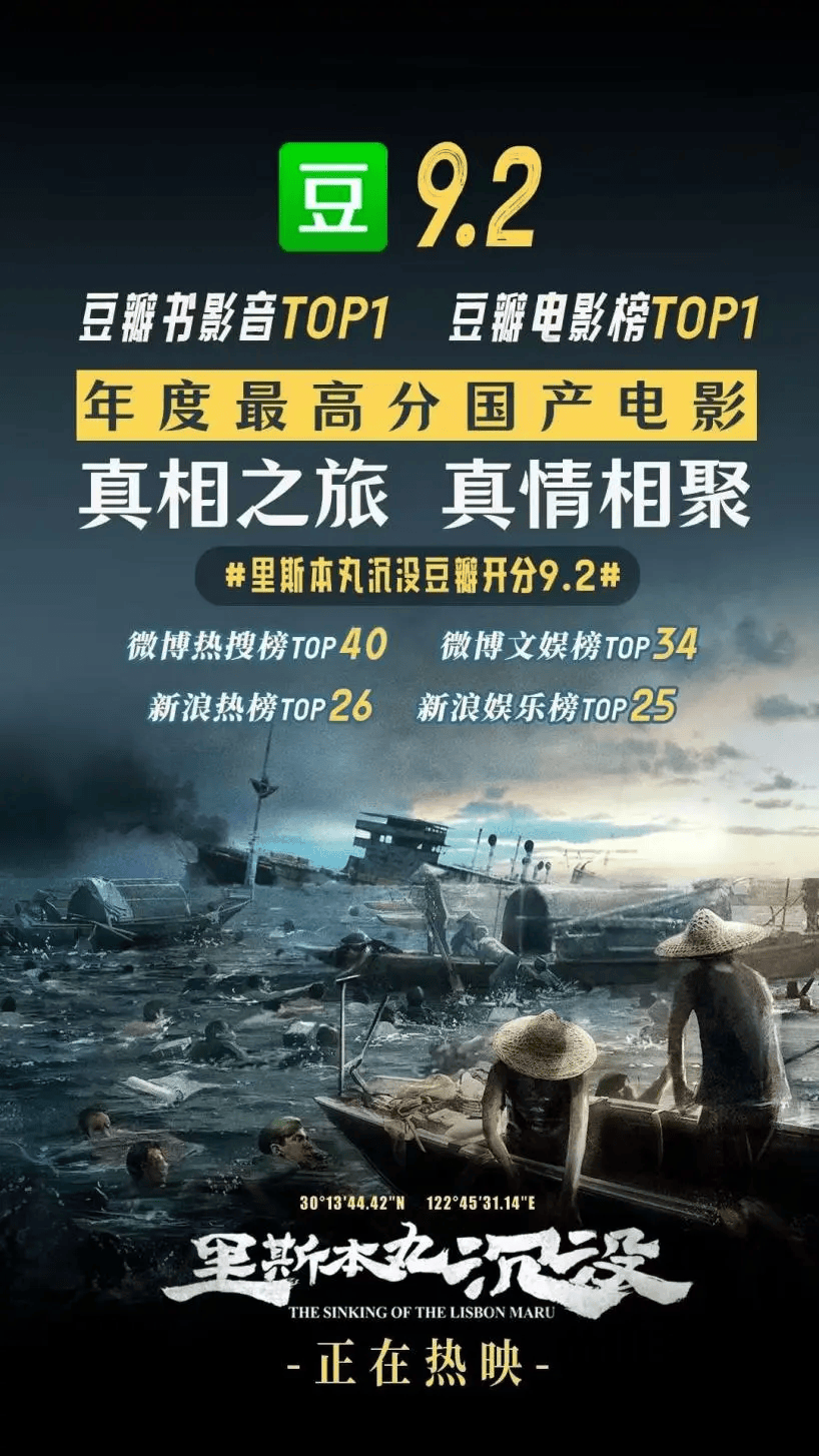电影上映时,两位幸存者和参与营救的最后一名中国渔民林阿根都已去世,但历史和公众会永远记住里斯本丸,记住“北纬30°13'44.42",东经122°45'31.14"”这个坐标。