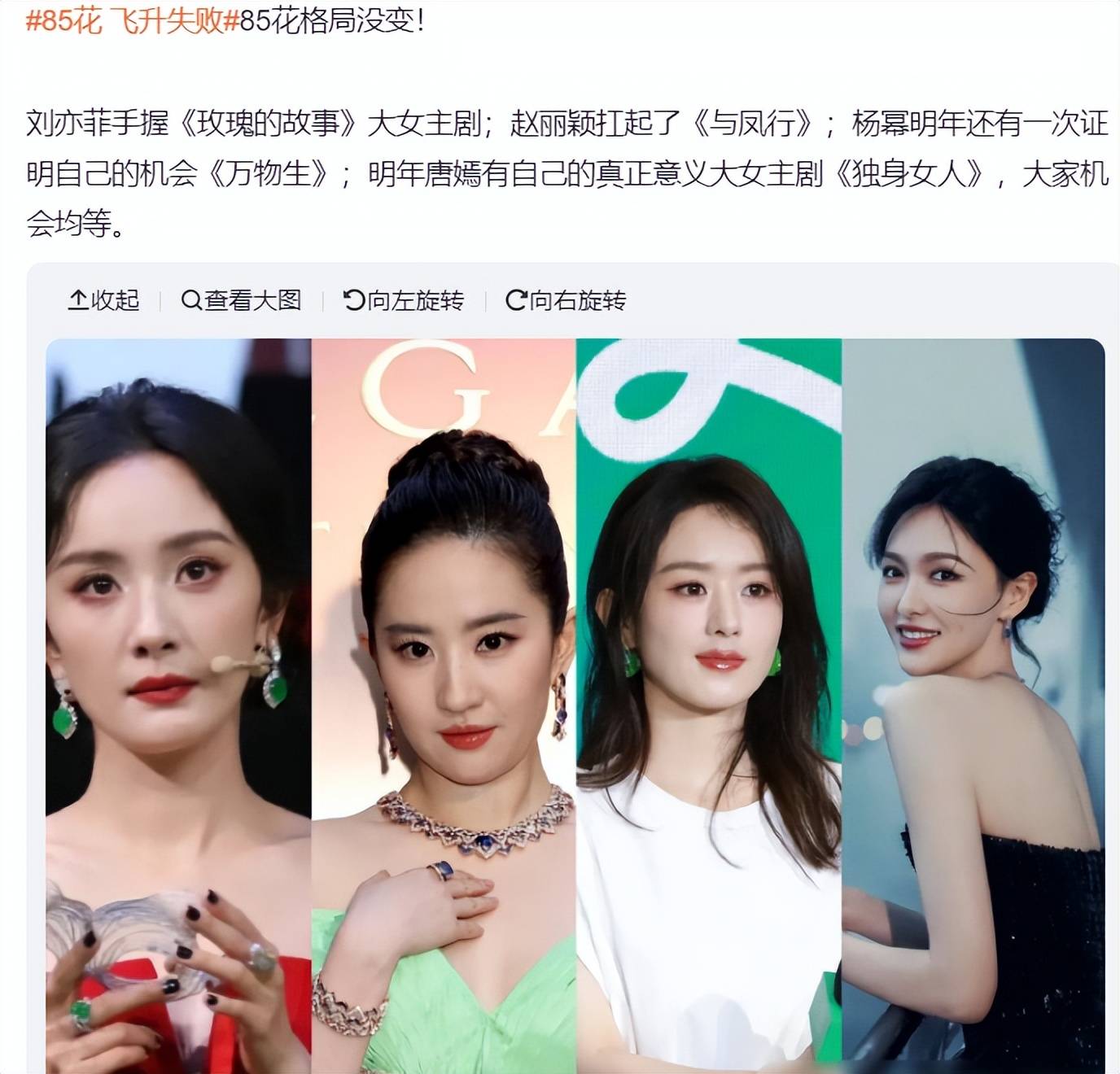 不得不说85花这个非正式的标签,在网友心目中认可度还挺高,快赶上当初70后的四小花旦头衔了。虽然是非官方不正式的归类评选,但一旦有了这个标签,好像就很难摆脱,然后总是被网友渲染出明争暗斗的气氛。