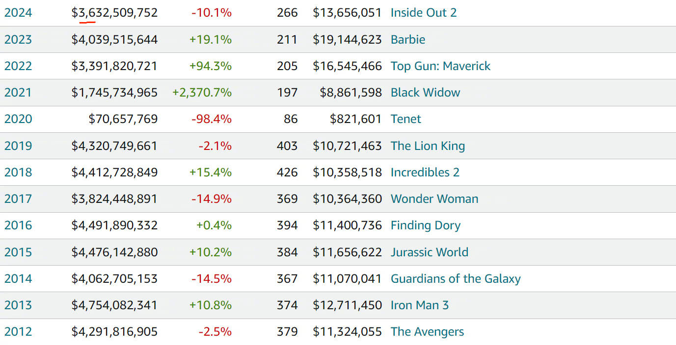 搜狐娱乐讯 在中国影市重要档期接连遭冷遇之下,北美影市的情况也不乐观。据媒体报道,2024年北美(包括加拿大)暑期档的成绩仅为36.3亿美元,比2023年同档期(40.3亿美元)跌了一成左右,这个数字也是(除新冠疫情2020-2022三年)近十年以来最差的成绩。此前最低的是2017年暑期档的38.2亿美元。