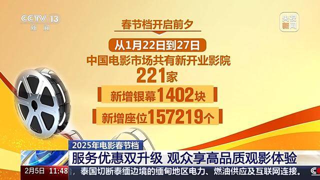 数据显示,春节档开启前夕,从1月22日到27日,中国电影市场共有新开业影院221家,新增银幕1402块,新增座位157219个。这些新落成的影院凭借其更先进的硬件设施和更优质的服务,为观众提供更为便捷和高品质的观影体验。