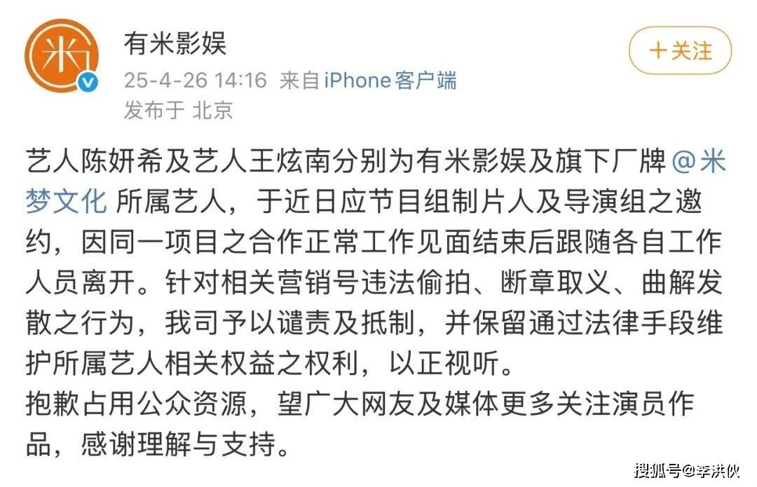 这次也不例外,对于这次的绯闻,陈妍希公司首先在微博贴出一张带着公章的声明,上面是一张艺人签约的告示,白纸黑字上写着“艺人王炫南系本公司签约演员”,明明白白地解释了陈妍希和王炫南之间的关系,没有所谓的恋情,不过是普通同事关系。