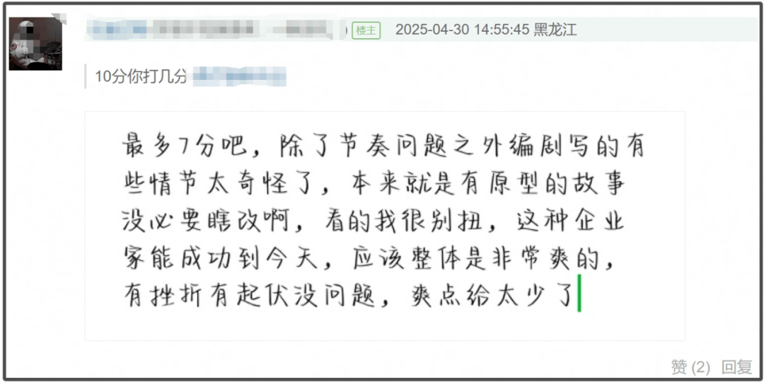 从观众给出的反馈来看,《水饺皇后》最大的问题就是叙事能力差。用观众的话来说,就是流水账式叙事,让观看的人深深地感到无聊、如坐针毡。故事中没有创业者的热血和坚韧,没有创业过程中的起伏跌宕,只有平淡无奇的日常记录,把臧健和女士创业的每一个阶段都拍的蜻蜓点水,毫无重点。