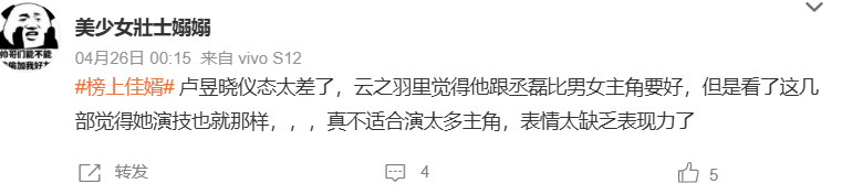 很多观众认为,这部剧的播出失利并不让人意外,剧集的缺点表现得很明显,最大的问题还是出在男女主角卢昱晓和王子奇的身上。