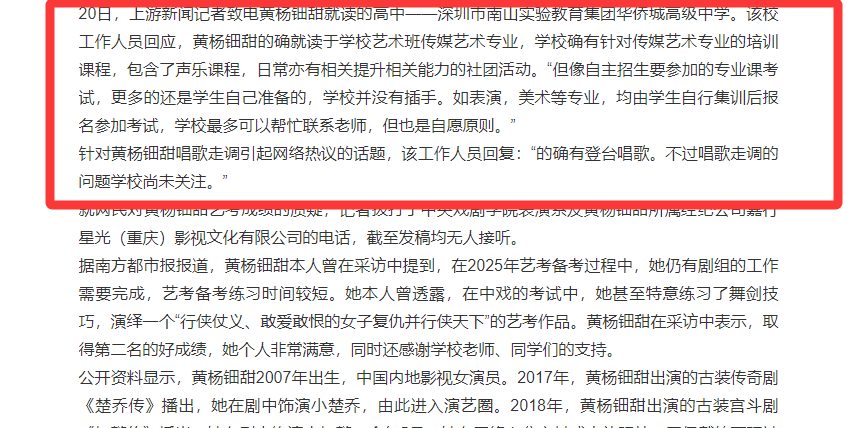 今年四月份,黄杨钿甜以超好的成绩获得中央戏剧学院表演专业第二名和北京电影学院表演专业第六名,如果说没有这段唱歌画面,也许这样的成绩不会惹来争议,但这样的唱歌水准,给人的直观感觉便是有猫腻。