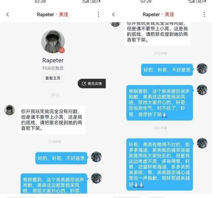 随后,Rap祥龙也对Rapeter进行了道歉!!!并已经下架了两首歌曲!