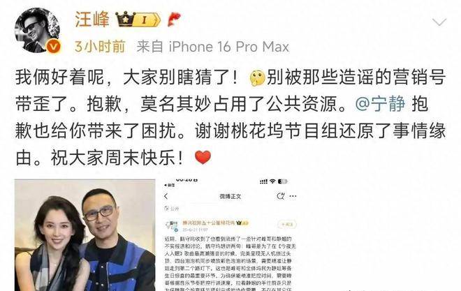 在6月21日,汪峰在社交媒体上发文,晒出与现任女友森林北的甜蜜合照,表示:“我们俩挺好的,不要再猜测了,也别被那些造谣的营销号牵着走。抱歉占用了公共资源,给宁静带来了困扰,感谢桃花坞节目组的澄清,祝大家周末愉快!”