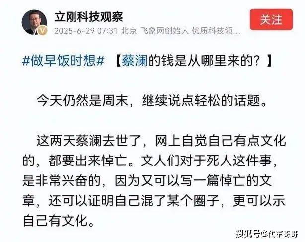 项立刚选择在蔡澜离世后发声,确实容易引发 “蹭热度” 的质疑。但翻看他的账号,不难发现这位科技博主向来以敢言著称。他曾炮轰过流量明星的虚假人设,也批评过文化圈的浮躁风气。此次对蔡澜的批判,是否真如他所说 “憋了多年的真心话”?值得玩味的是,不少被他怼过的名人粉丝,这次竟罕见地站在他这边。