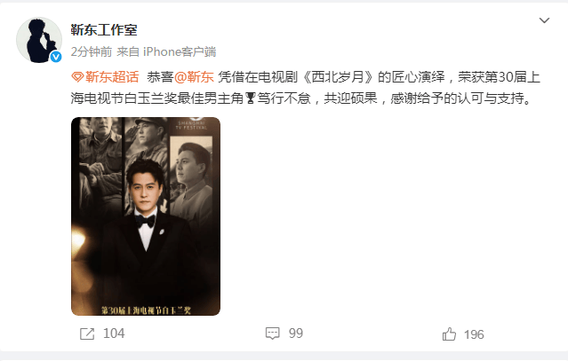 恭喜靳东凭借在电视剧《西北岁月》的匠心演绎,荣获第30届上海电视节白玉兰奖最佳男主角。笃行不怠,共迎硕果,感谢给予的认可与支持。