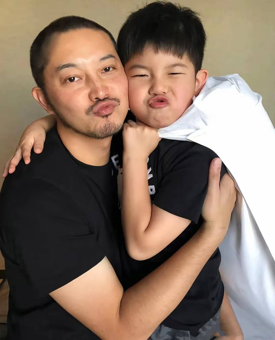 胡可和沙溢有两个儿子,大儿子安吉、小儿子小鱼儿。首先是胡可晒出了和小儿子在一起的亲子照,他们都穿着粉色T恤,还原几年前拍照时候的场景。