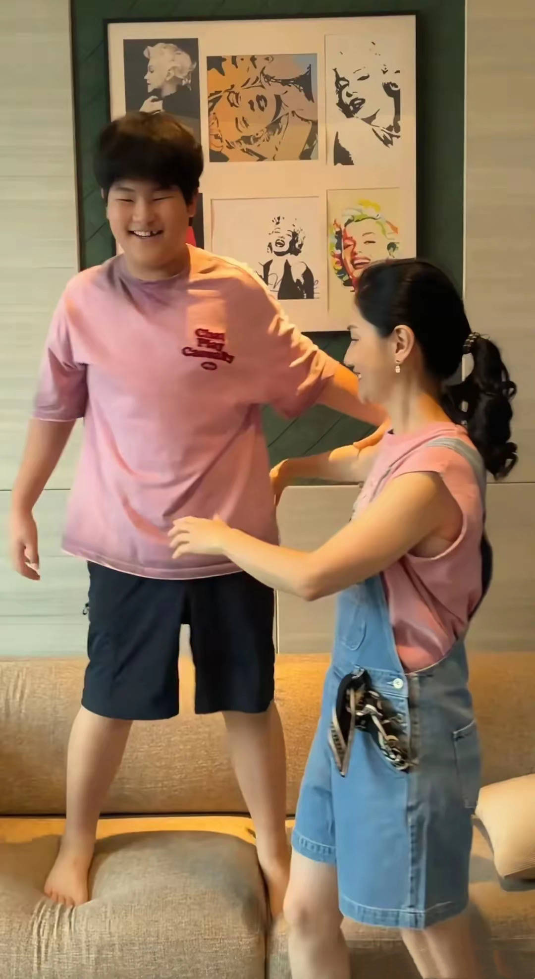 胖乎乎的小鱼儿和妈妈一起拍亲子照,他在沙发上蹦蹦跳跳非常快乐。小鱼儿只是个子高、其实他年纪小,还处于换牙期、上排有一个牙齿很明显的缺失。