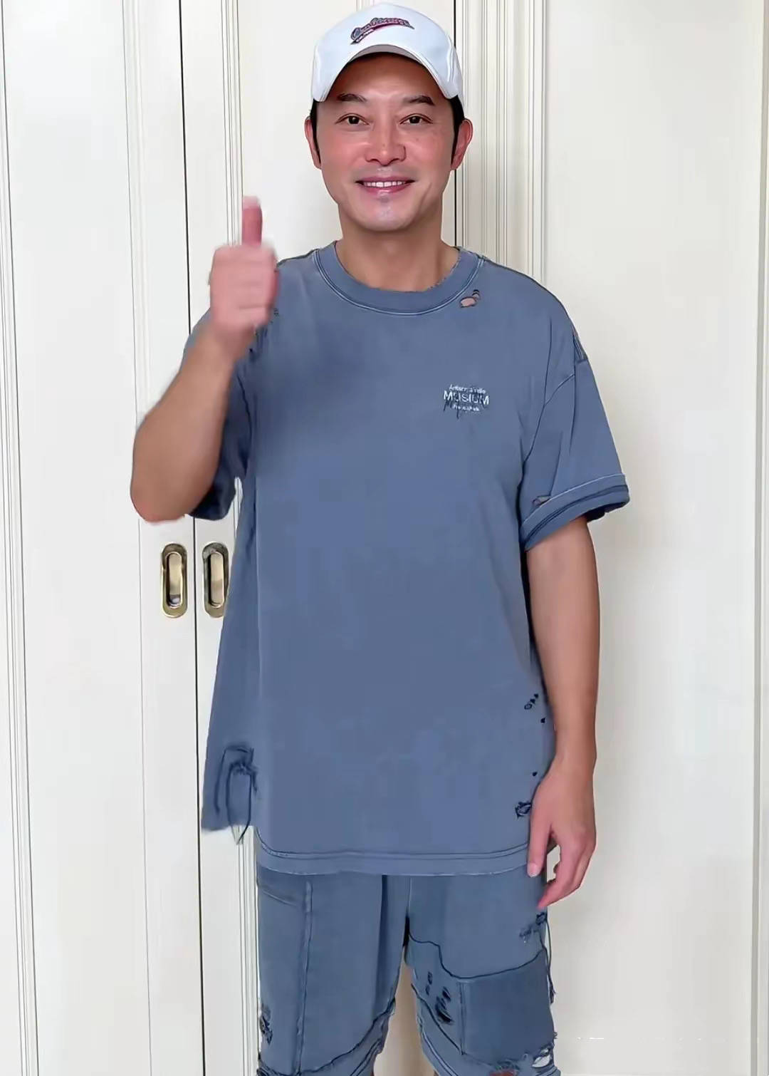 他穿着非常潮流的T恤,领口、袖边、以及下摆,都有好几处的破洞,这种“乞丐风”没想到大叔年纪的沙溢还很喜欢。