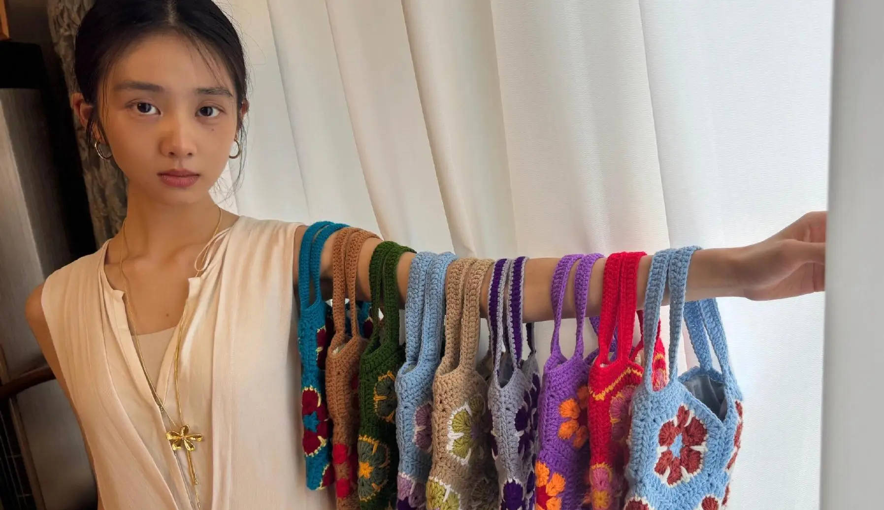 黄多多的手臂上挂满了奶奶做的钩织包。