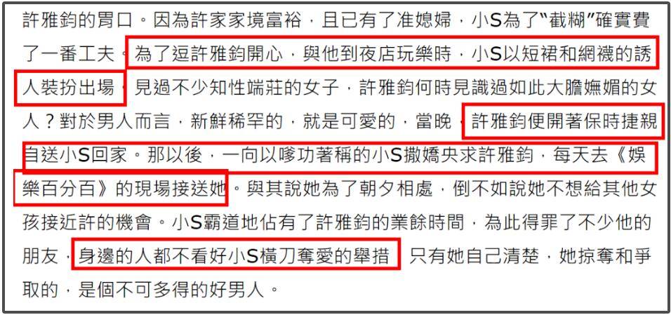 许雅钧当时有未婚妻,门当户对白富美,小S得知许雅钧喜欢泡夜店,靠着超短裙渔网袜成功吸引了对方注意力,花了三个月时间,让许雅钧和未婚妻分了手。