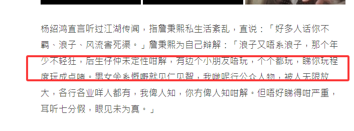 关于其为何被雪藏,港媒还曾指出,他是因为私生活混乱的结果。面对这样的质疑,多年后,詹秉熙表示:浪子又不是浪子,那个年少不轻狂,男女的关系就是仁者见仁智者见智,我是公众人物,被无限放大,耳听七分假,眼见未必是真。
