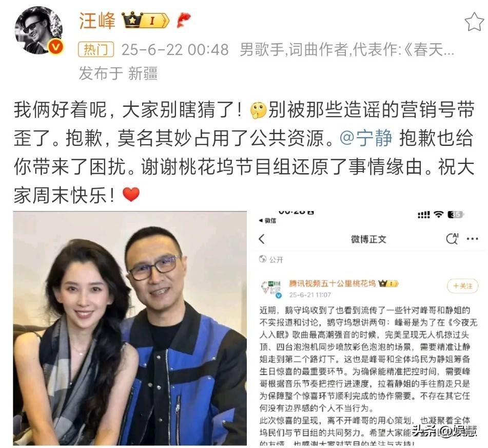 7月凌晨,汪峰晒出与女友森林北的合照辟谣分手传闻,同时也向被无端卷入舆论的宁静道歉。