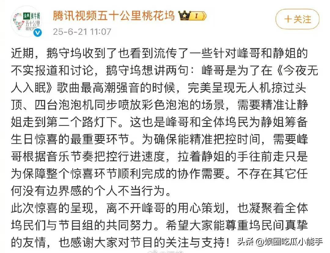 从节目组的发文来看,这一切都是节目组准备的,为了整个惊喜的准备,和准确控制时间和进度,才有了汪峰拉宁静往前走的那一幕,只是协作需要,并不任何不当行为。