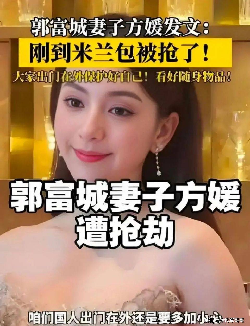 2025 年 2 月 26 日,郭富城妻子方媛在社交平台发布称自己在米兰机场遭遇抢劫,手提包内证件银行卡相机等财物丢失。27 日晚,方媛在社媒再次发文回应此事,表示事情发生后,已及时报警及寻求中国驻米兰大使馆协助,大使馆的工作人员效率十分高,迅速处理,“也让我感受到了祖国的温暖!”