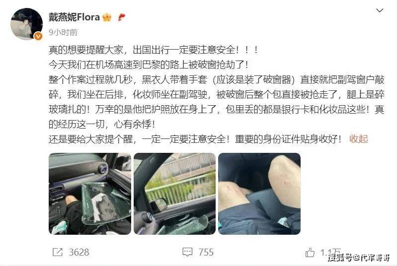 7 月 7 日,戴燕妮发文表示自己在巴黎机场高速到市区的路上被破窗抢劫,整个作案过程就几秒,黑衣人带着手套,直接就把副驾窗户敲碎。