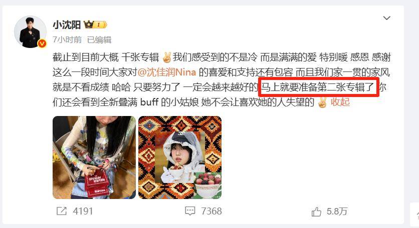 7月2日,小沈阳在社交平台发文称,截止到目前,大概千张专辑,我们感受到的不是冷,而是满满的爱,特别暖。