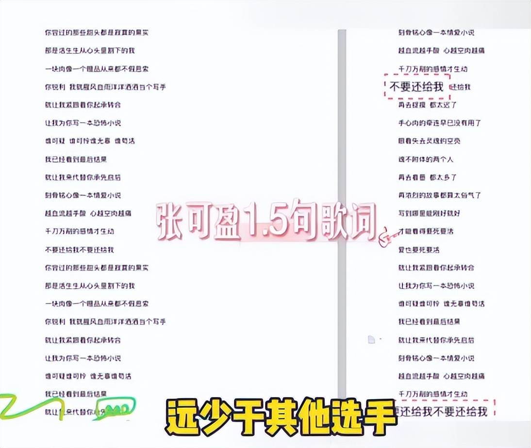 在团队表演分词环节,队长为追求“绝对公平”采用平均分配,导致张可盈仅分到1.5句歌词,而其他成员每人8-9句。她冷静提出异议,希望能够从另一位歌手那里分几句给自己。