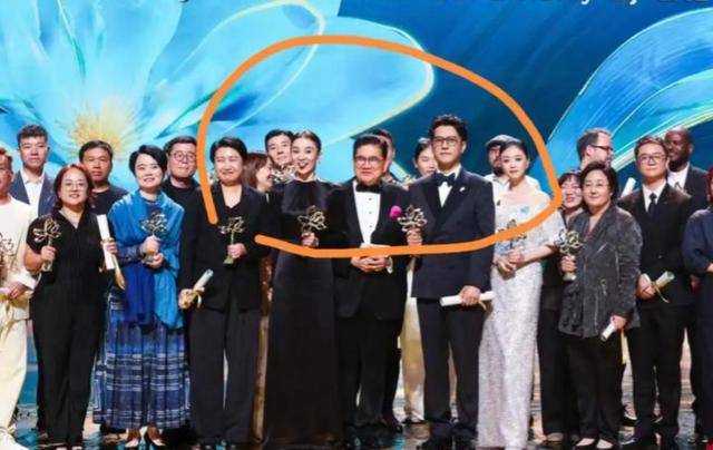正当获奖的靳东和宋佳谦虚地站在中间时,一道身形宽大的黑影正以迅雷不及掩耳之势插入其中,成为实打实的C位。