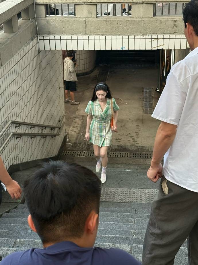 林允身穿浅绿格纹西装裙,搭配橘色小包。