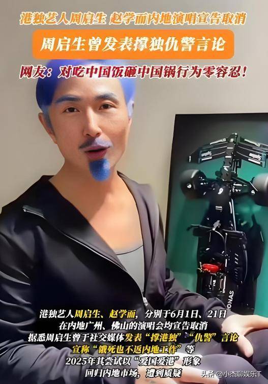 单依纯的遭遇并非孤例。香港资深音乐人周启生,凭借《天长地久》《离乡别井》等名曲风靡一时,被誉为粤语歌坛第一代创作歌手。然而2020年,他在采访中公然宣称“饿死也不回内地”,并留言“HKnotChina”,引发大陆歌迷强烈不满。2025年,他试图借“爱国”形象复出举办内地演唱会,却因旧言论被曝光,最终演唱会被取消,复出梦碎。国家统一底线不可逾越,任何分裂言论都会被钉上耻辱柱。