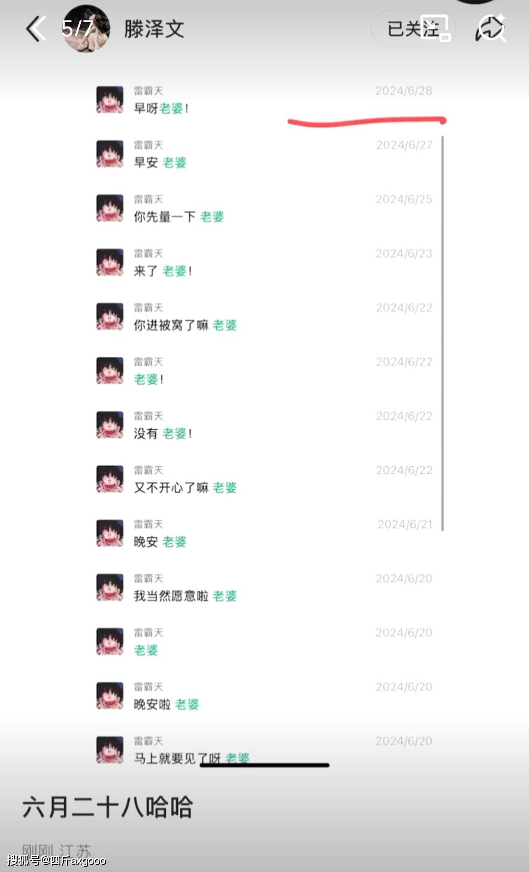 截图显示田栩宁多次以 “老婆” 相称,时间标注为2024年6月份。