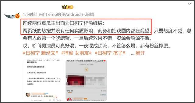 不过有关田栩宁孕期出轨的事件发酵了一晚上,公司也没做出回应,田栩宁美美隐身,还有心情点赞自己的路透,照常拍戏,似乎一点儿也没受到影响。