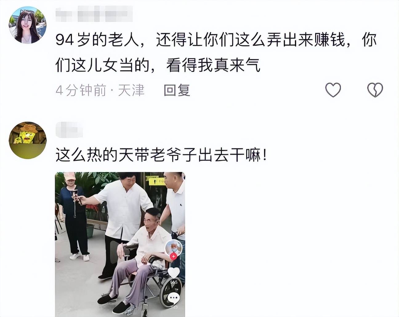 当时就有网友质疑杨议为了圈钱,全然不顾老父亲的身体,这种高温天换做健康年轻人都不大吃得消,更何况这位耄耋之年的老人。