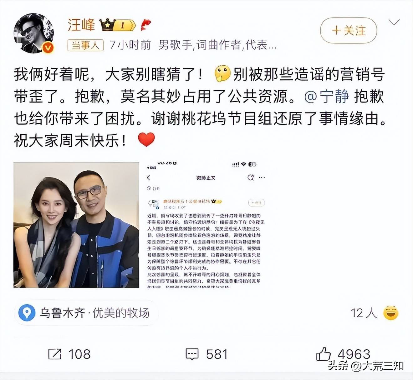这场风波的根源,源于2025年6月一档音乐综艺的录制现场。画面中,汪峰与嘉宾宁静肩并肩走向舞台,突然伸手牵住她的手,动作显得如此自然,仿佛早已默契。节目播出后,汪峰与宁静牵手的新闻迅速冲上热搜,但真正引发舆论的,是他们之间错综复杂的关系——汪峰刚与第四任妻子章子怡离婚不久,此时他正与新女友森林北热恋;而宁静则是圈中出了名的直率选手,因犀利发言多次成为头条。网友们很快扒出,这并不是汪峰第一次在节目中制造暧昧气氛:在2023年,他也曾在另一档综艺与女嘉宾贴面合唱,被指责刻意制造CP。