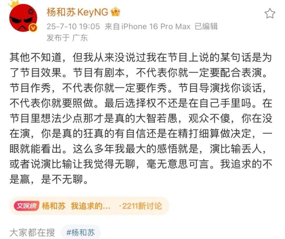 不过,令人没想到的是,作为之前节目导师的杨和苏,发长文开火了所谓的“节目效果”。