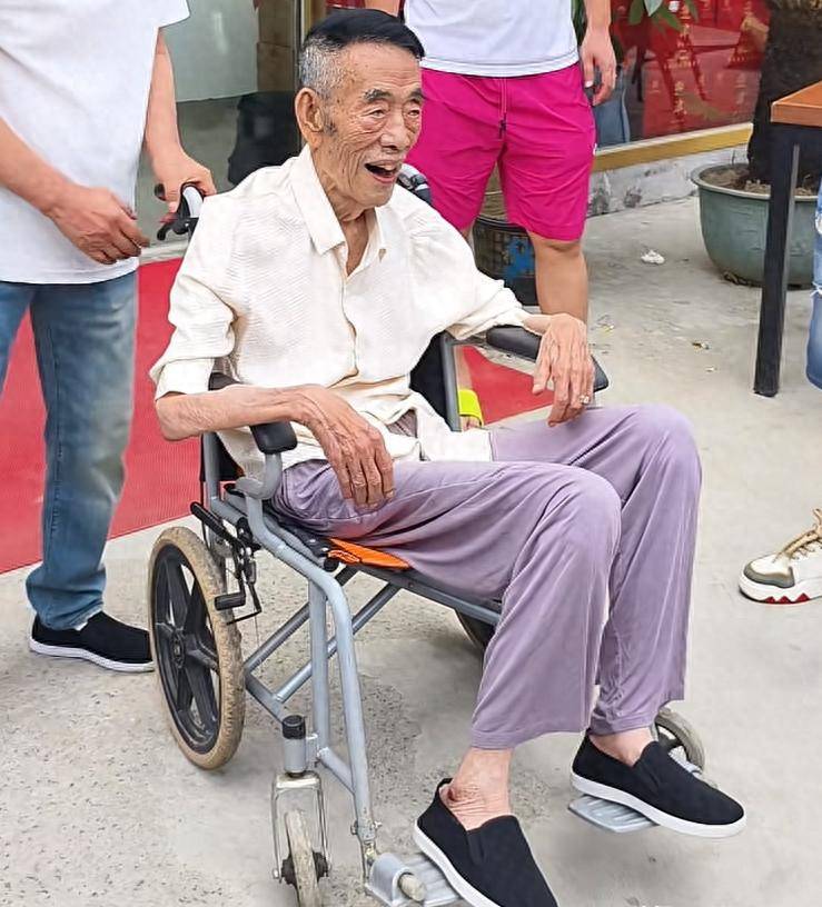 94岁高龄,接近40度的高温,坐着轮椅,就这样还被儿子推着出来营业。