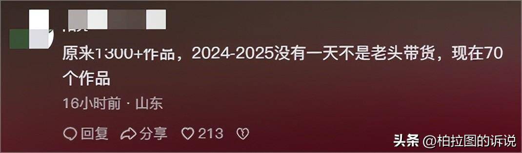 更有一直关注杨老爷子日常的粉丝在评论区说:“原来1300多条作品,从2024年到2025年的,没有一天不是老爷子帮忙带货的,现在就剩下70个作品。”