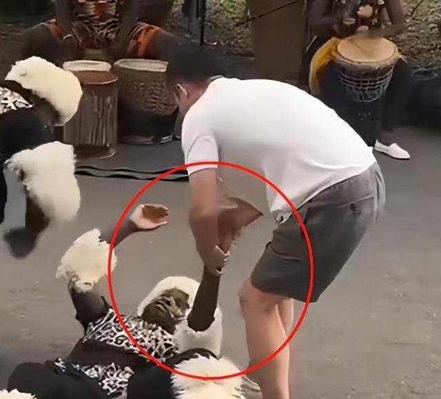 在周围人的喝彩声中他和表演人员下场开始互动。