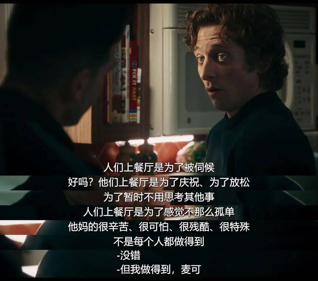 也就是在这个过程中,男主的心态也发生了一些变化,他突然意识到自己对于熊家餐馆的坚持,其实来自内心潜在的各方压力,比如哥哥的突然离世,与女友剪不断理还乱的亲密关系,过去做米其林厨师时留下的社畜PTSD,还有一部分想要证明自己的决心。