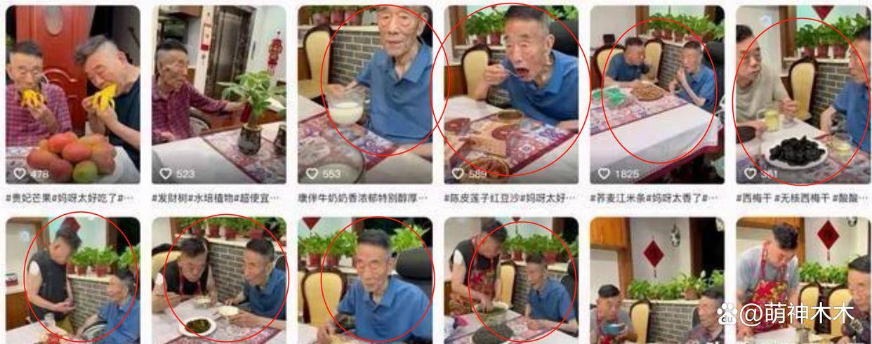 根据其儿子为其开设的带货账号显示,每天少则一两条,多则八条,内容基本为吃饭和带货。这对一位94岁的老人来说,无疑是一份沉重的负担。更别提,账号上的许多食物都是干果或水果,老人咀嚼起来不便,不止一次露出咬不动的表情。