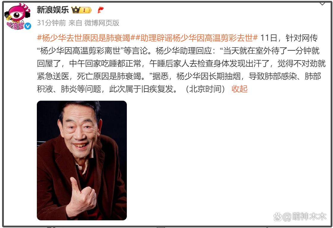 杨少华大师的去世令人深感惋惜。虽然他享年已逾九十,算得上高龄佳话,但他儿子们的处理方式却引发了不少争议。尤其是在他离世当天,竟有人高温下带老人去剪彩的细节,随后回家后感到不适并送医,最终仍不幸去世。这一系列事件引发了外界的质疑,但杨少华家属并未作出回应,只有他的助理接受采访作出了解释。