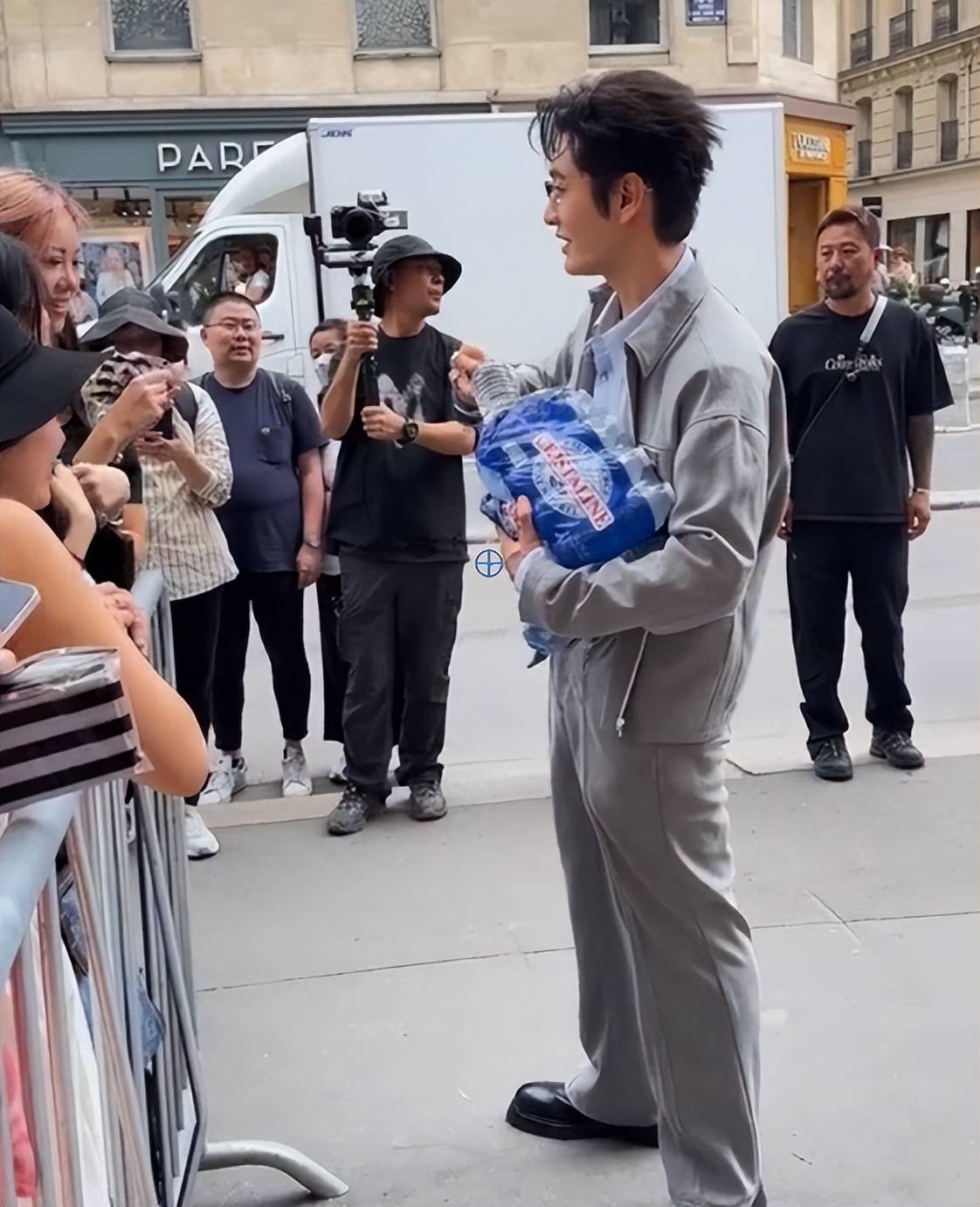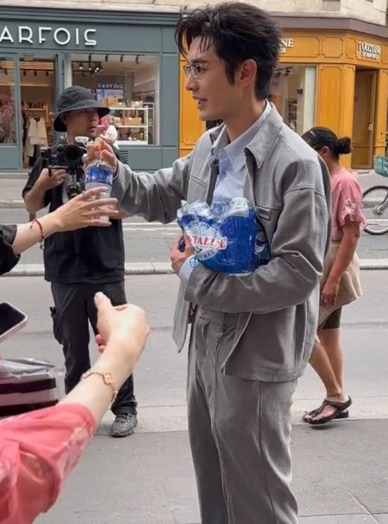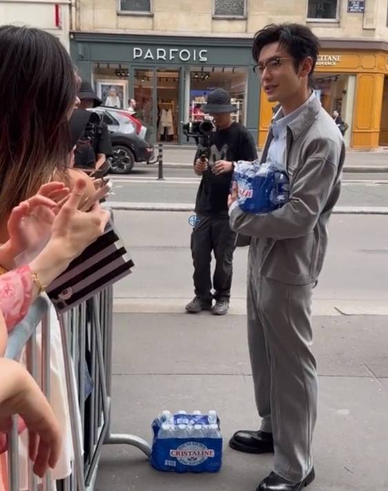 不过因为现场粉丝比较多,两件矿泉水很快就发完了。看到还有粉丝没分到,黄晓明又再次返回剧组,抱了好些瓶过来。