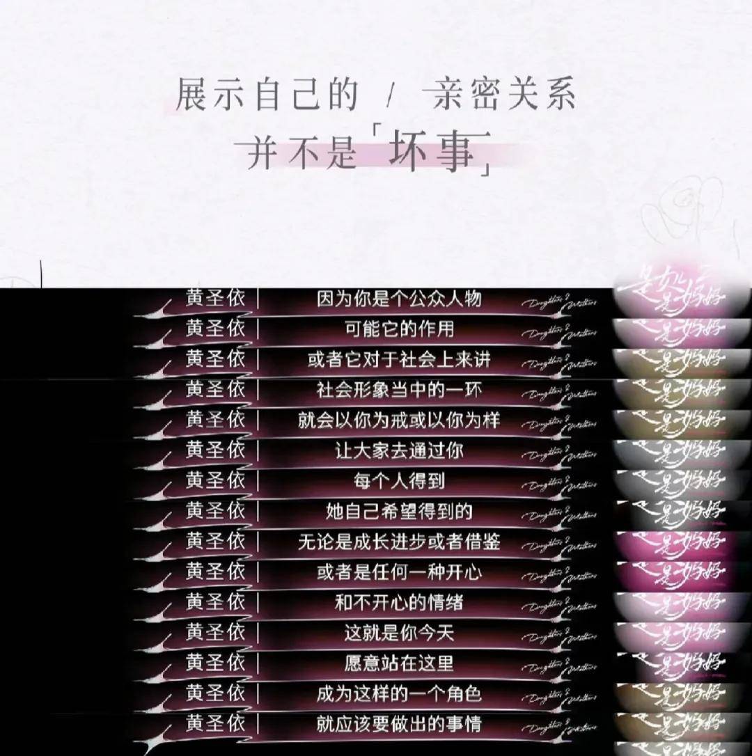 在《女儿是妈妈》的节目里,一位脱口秀编剧在为黄圣依撰写稿子时,问了一个很多观众心里都想问的问题:“您参加了这么多芒果台的综艺,几乎把所有的亲密关系都曝光了,您觉得这样好么?”