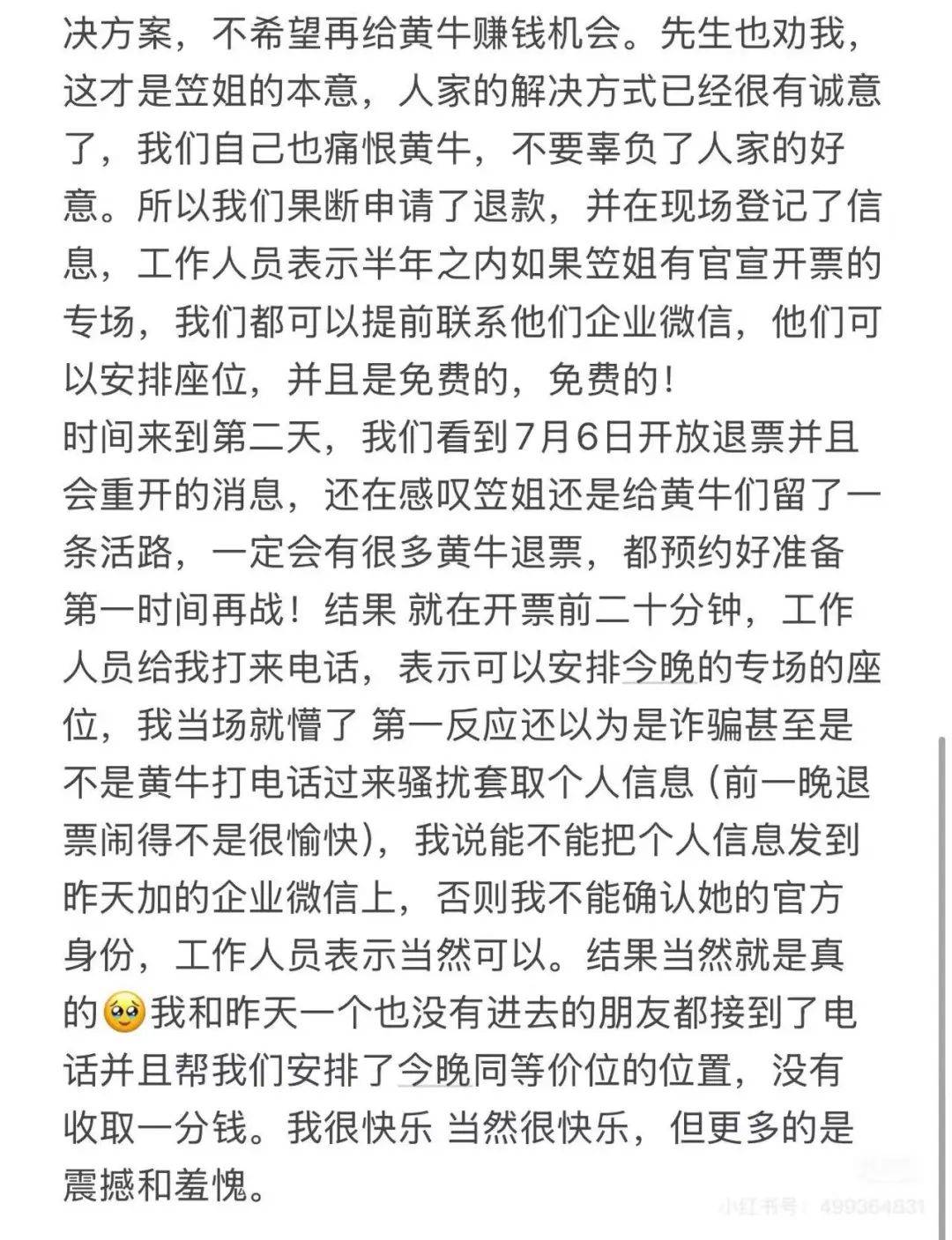 “所以我们果断申请了退款,并在现场登记了信息,工作人员表示半年之内如果笠姐有官宣开票的专场,我们都可以提前联系他们企业微信,他们可以安排座位,并且是免费的,免费的!”