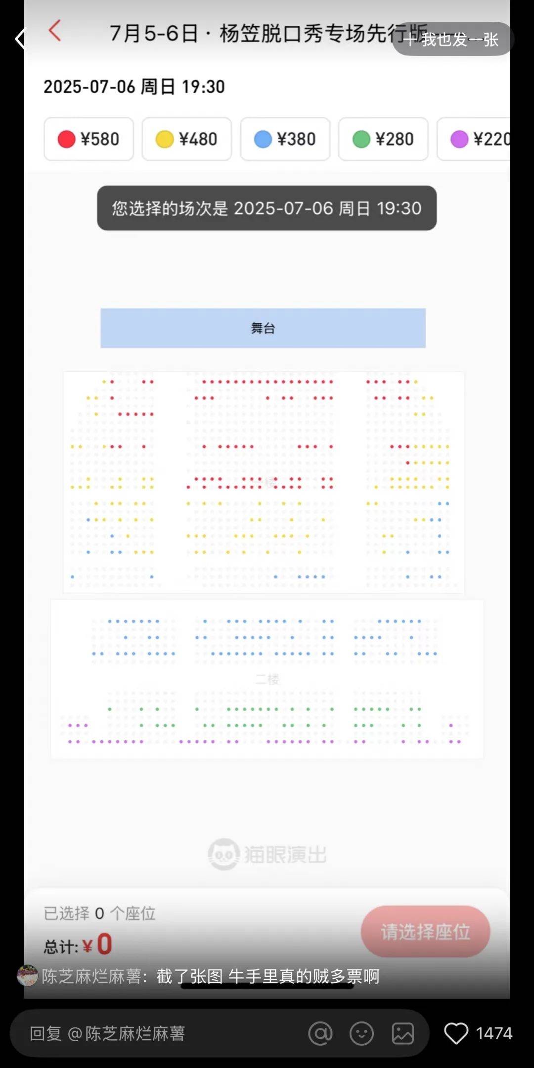 7月5日晚上,严格执行“强实名制”,黄牛票没办法入场后,杨笠官方发声明允许退票,紧接着对7月6日(周日)的演出进行了二次开票。在正规购票平台,出现了许多前排位置,这些位置基本是之前黄牛屯在手里的。