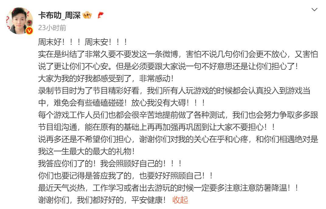周深是这么说的“实在是纠结了非常久要不要发,害怕不说几句你们会更不放心,又害怕说了更让你们不心安。但是必须要跟大家说一句不好意思还是让你们担心了!大家为我的好我都感受到了,非常感动!录制节目时为了节目精彩好看,我们所有人玩游戏的时候都会认真投入到游戏当中,难免会有些磕磕碰碰!放心我没有大碍!每个游戏工作人员们也都会很辛苦地提前做了各种测试,我们也会努力争取多多跟节目组沟通,能在原有的基础上再再加强再巩固到让大家不要担心!说再多还是不希望你们担心,谢谢你们对我的关心在乎和心疼。”