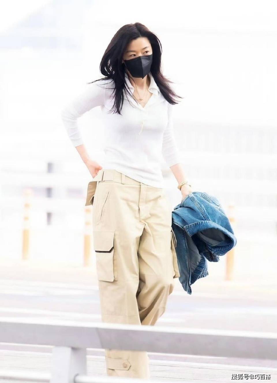 在韩国这个流行小骨架且身材骨感的国家,全智贤以高个子大骨架拓宽了人们的认知和眼界,纯白色Polo衫搭配卡其色工装裤,简约精致、时髦耐看。