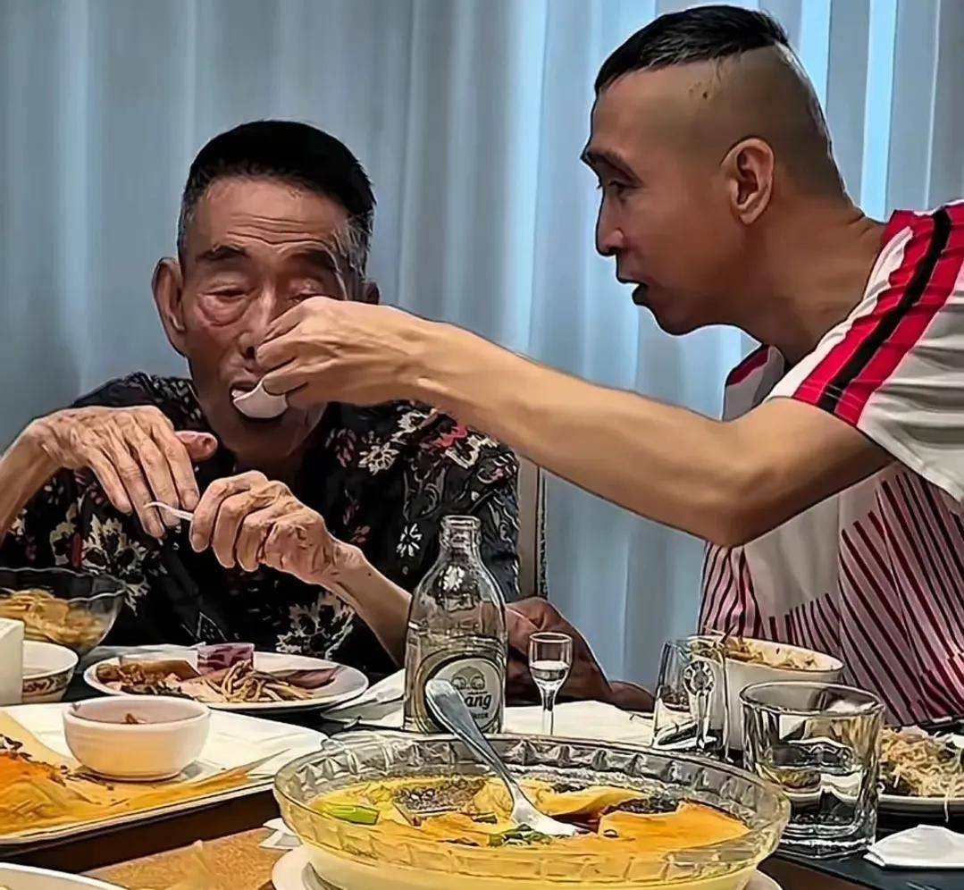 当时老人已经吃不下多少东西,韩兆还是细心的喂他吃一些。