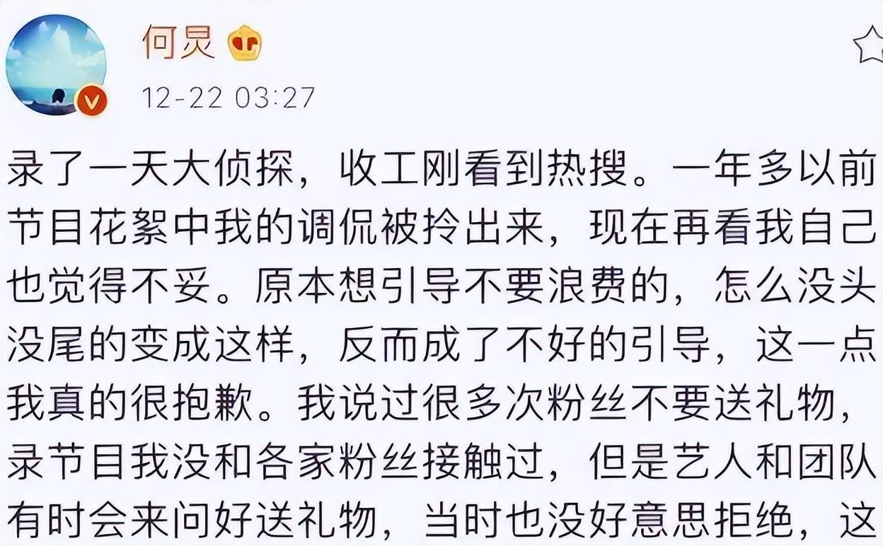 多年前在一档综艺中的送礼发言也被扒了出来,当时何炅和沈梦辰在《口红王子》中聊,吐槽粉丝送礼物的标签太牢,撕都撕不下来,还表示自己有20多个保温杯,50多支笔。