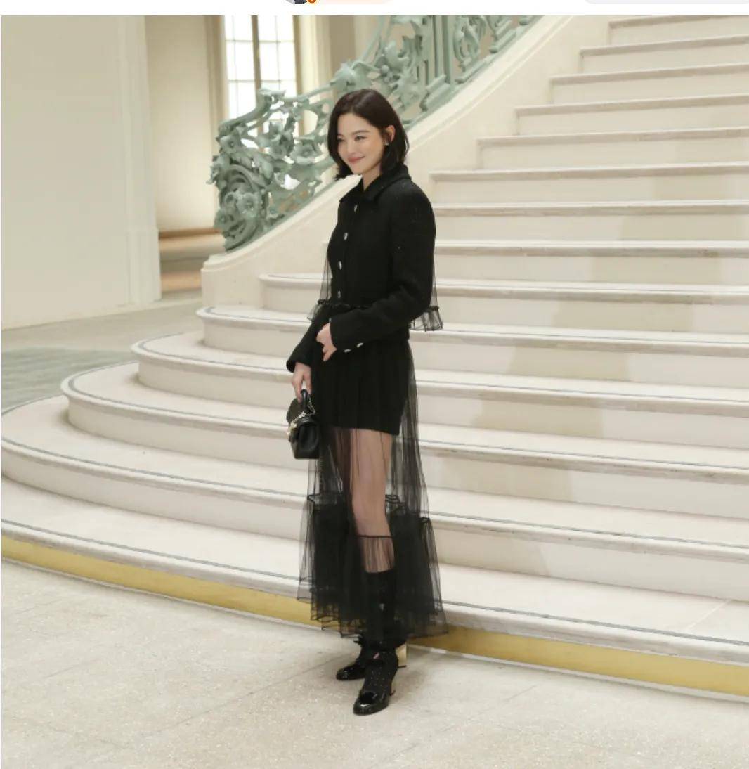记得前几天辛芷蕾还去了法国参加大秀,她的这一套黑色的短款裙子真的是美到了心坎里。