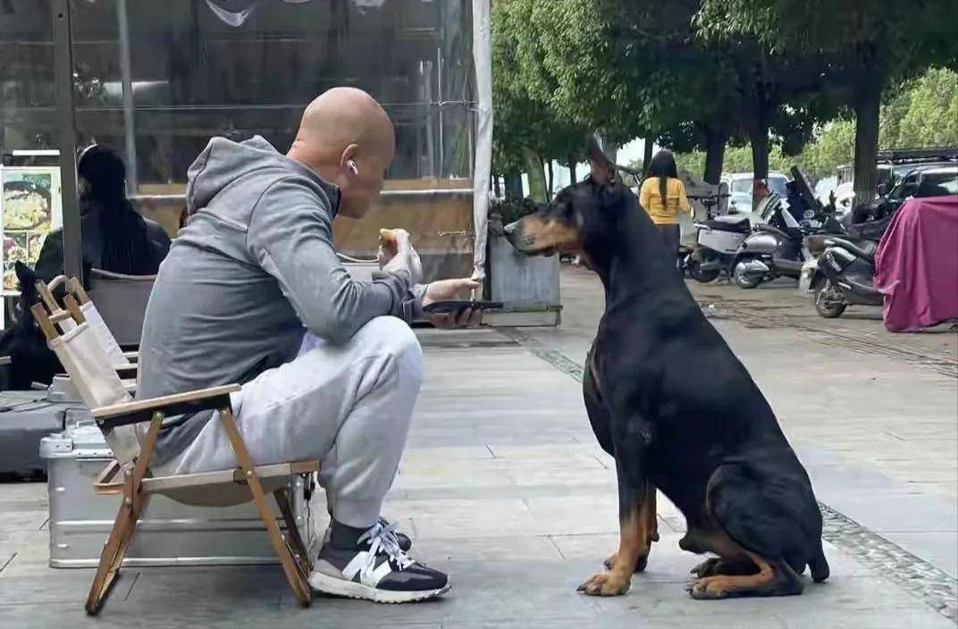 还会分给宠物狗一点点心,陪它玩,他也是身穿一身休闲的运动服饰,带着耳机看着手机。