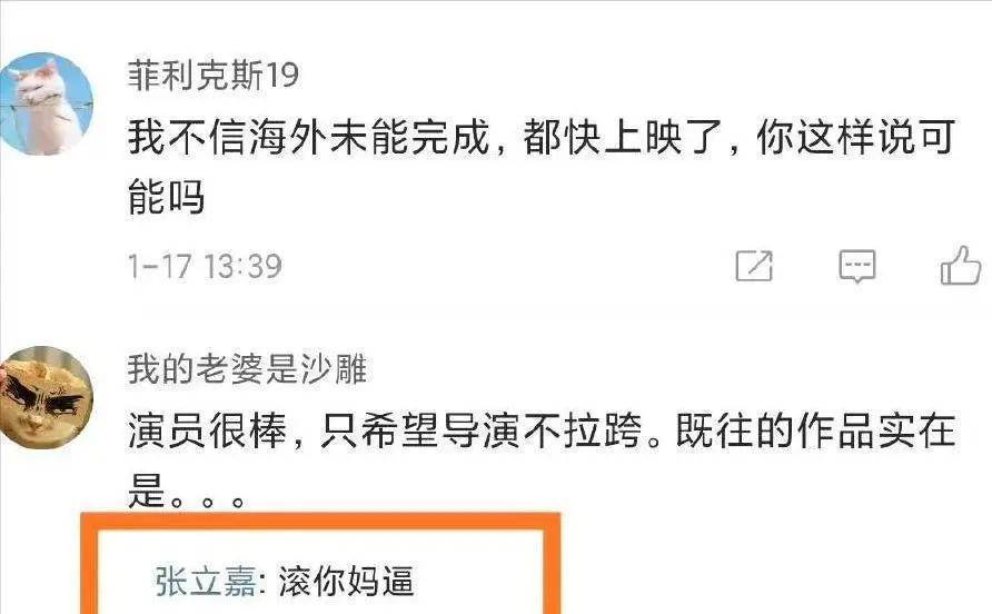 一位网友评价“演员很棒,只希望导演不拉垮,既往的作品实在是...”张立嘉导演看到后,居然用粗口狂骂“滚你妈逼”,可见他的素质极其低下!