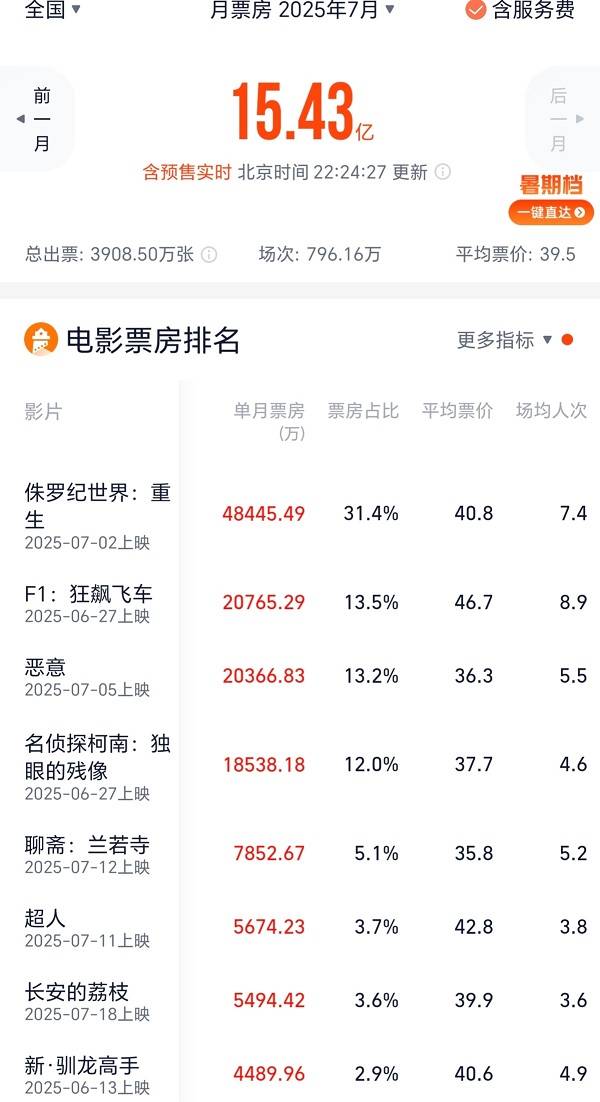 票房冠军《侏罗纪世界:重生》贡献了31.4%票房,六月底上映的《F1:狂飙飞车》占据七月票房榜第二,贡献了13.5%票房。